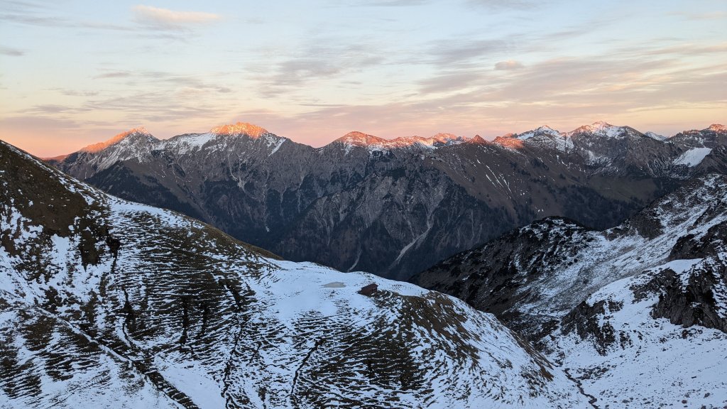 Abstieg, der Rauhhornzug im letzten Sonnenlicht.