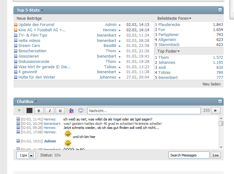 Als neue (altbekannte ^^) Funktionen wurde der Block mit den neuesten Beiträgen über der Chatbox eingefügt. Beide Funktionen sind nur für angemeldete Benutzer sichtbar.